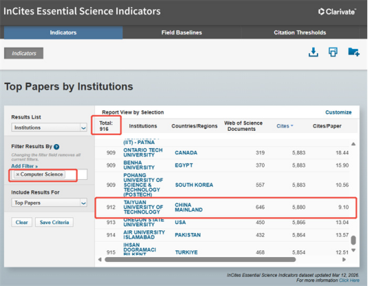 On March 12, Clarivate Analytics, a global provider of authoritative professional information, released the latest statistical results of the Essential Science Indicators (ESI) for March 2026. TYUT achieved a milestone breakthrough in disciplinary development: Materials Science has ranked in the ESI global top 1‰ for the first time, officially joining the ranks of world-leading disciplines. This brings the number of TYUT’s ESI global top 1‰ disciplines to two. Additionally, Computer Science has newly entered the ESI global top 1%, adding a significant new growth pole to TYUT’s disciplinary landscape. The achievements mark a leap forward in TYUT’s international academic influence and core competitiveness.