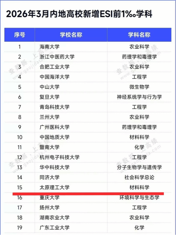 The data indicate that, compared with ESI statistics from January 2026, TYUT achieved a dual increase in the number of ESI global top 1‰ disciplines and top 1% disciplines. In the ranking of domestic universities by number of ESI top 1% disciplines, TYUT’s position rose significantly by 27 places, with a pace of advancement ranking among the top nationally. Currently, TYUT’s Engineering (which entered the ESI global top 1‰ in January 2025) and Materials Science (which entered in March 2026) form a “dual-engine” of top-tier disciplines, leading disciplinary development collaboratively. Seven disciplines—Engineering, Materials Science, Chemistry, Geosciences, Environment/Ecology, Computer Science, and Physics—are now in the ESI global top 1%. This has shaped a high-quality disciplinary development pattern characterized by “leading strengths, multi-point breakthroughs, and a tiered progression,” fully demonstrating TYUT’s distinctive feature of focusing on engineering while deeply integrating science and engineering, along with its profound disciplinary foundation.